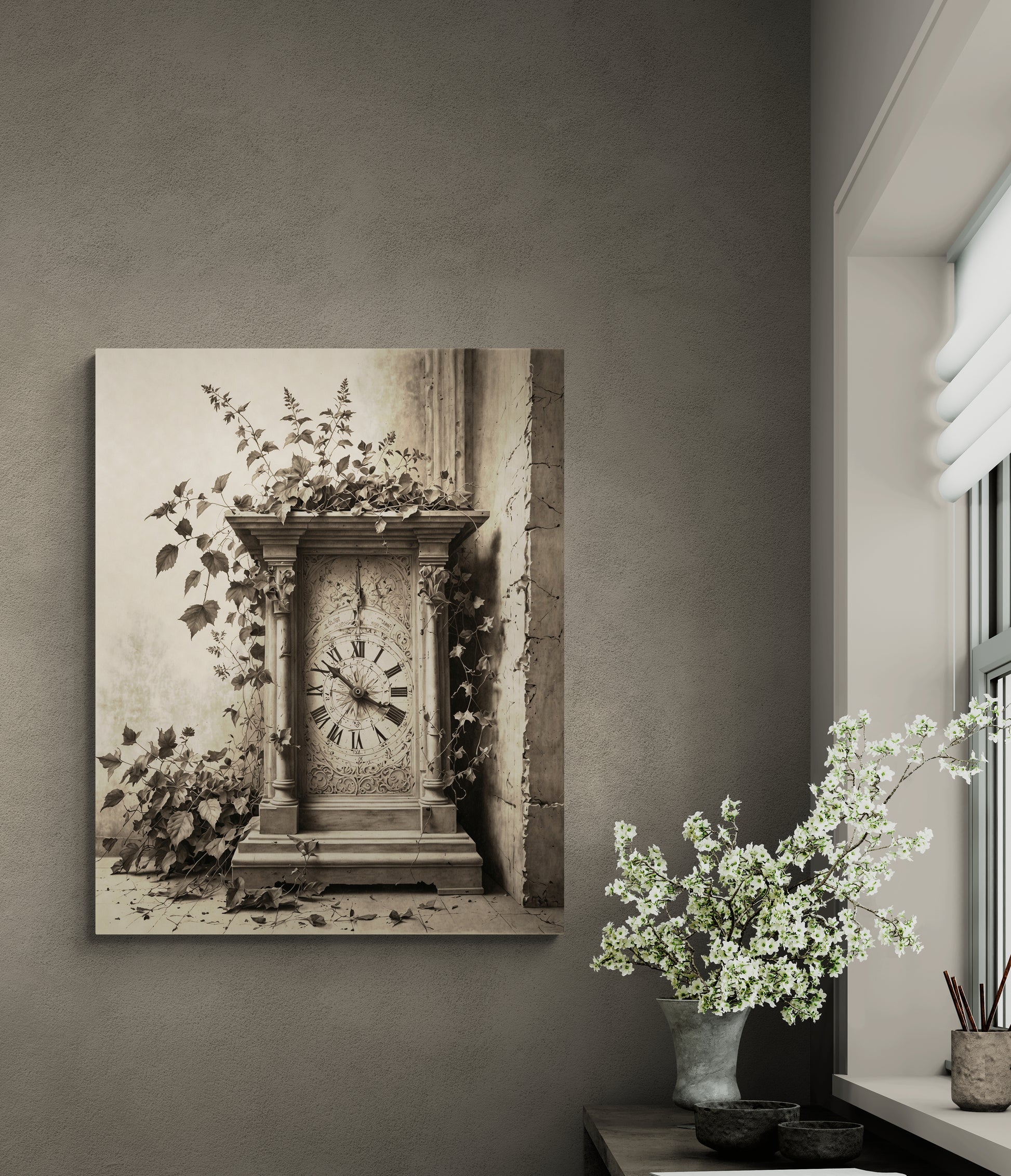 [nature and time canvas art, minimalist graphite wall art, poetic sundial sketch print, vine and leaf canvas décor, calming time-inspired wall print, botanical pencil drawing for home, elegant slow living artwork]