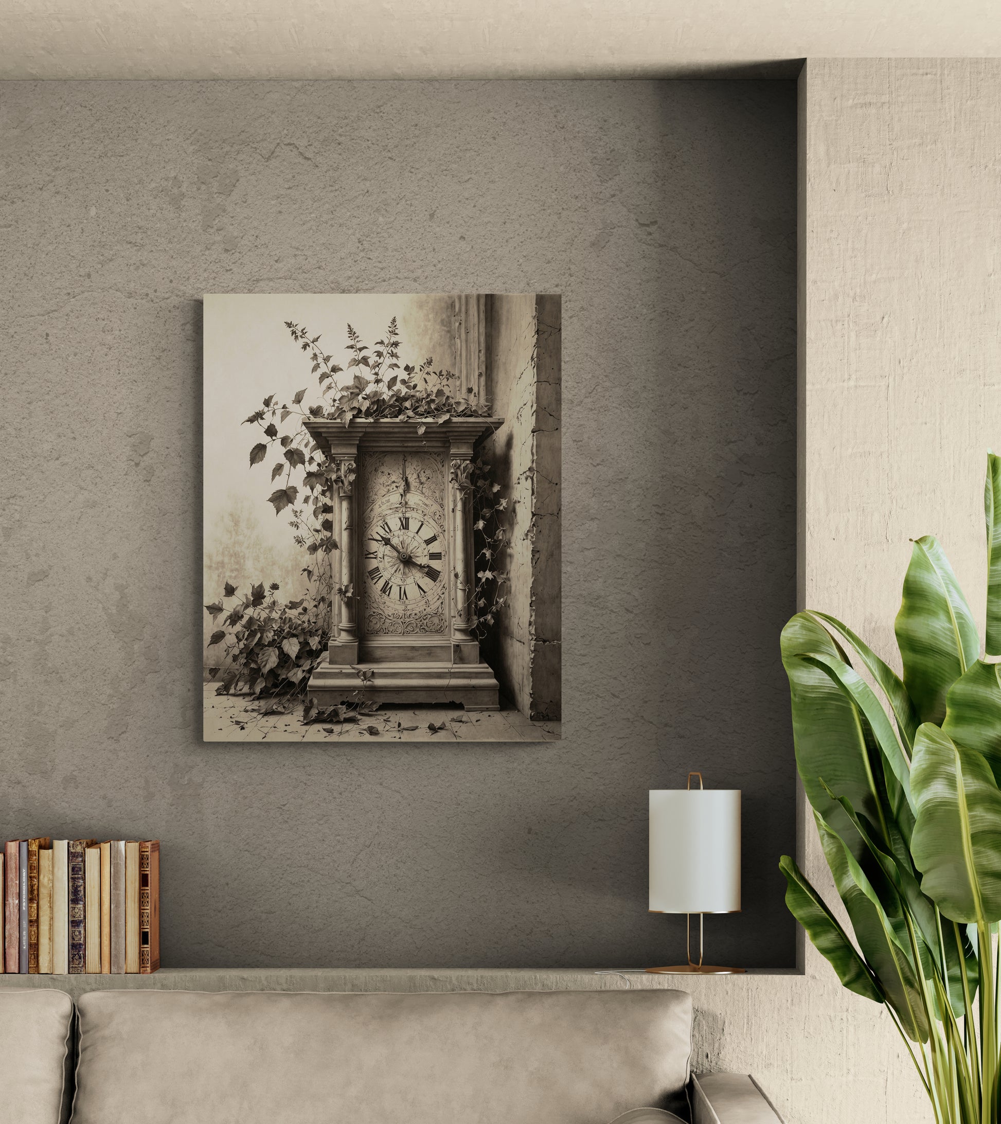 The Garden Between Seconds is a poetic printed canvas wall art featuring delicate pencil sketches of climbing vines growing through an old sundial. Fine graphite lines trace time's passage as tiny leaves and petals gently disrupt the clock’s rhythm. With soft shadows and no background, this minimalist artwork creates a sense of stillness and introspection. Ideal for serene living rooms, bedrooms, or study spaces, this timeless piece adds contemplative charm to any home décor.
