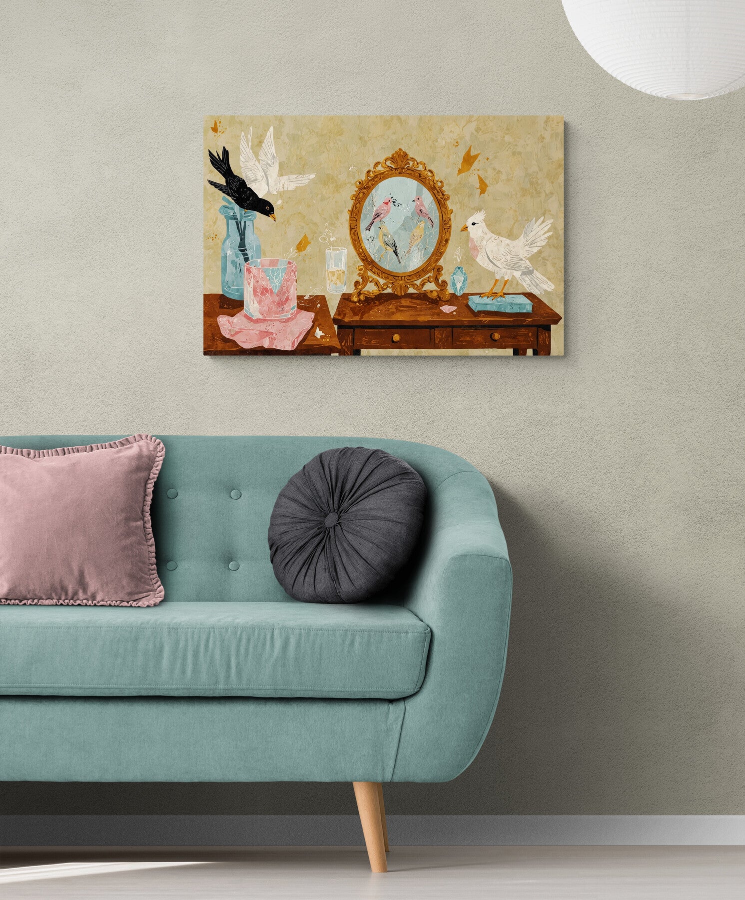 Gilded Reverie captures timeless elegance in a vintage-style printed canvas featuring a gilded mirror reflecting a soft, minimalist interior. Crystal glassware and a delicate bird sculpture add quiet opulence. Ideal for refined living rooms or elegant bedrooms.