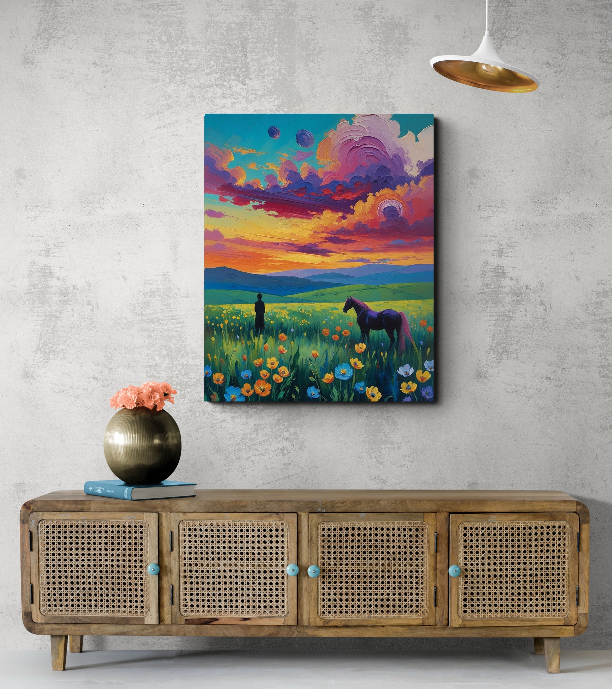 This vibrant printed canvas artwork portrays a dreamlike meadow bathed in the hues of a surreal sunset sky. Rolling green hills stretch into the distance under dramatic, swirling clouds in lavender, orange, and deep magenta. A lone figure and a majestic horse stand amidst blooming wildflowers, evoking themes of freedom, wonder, and cosmic stillness. Ideal for bedrooms, meditation corners, or art-loving interiors that seek a poetic touch.