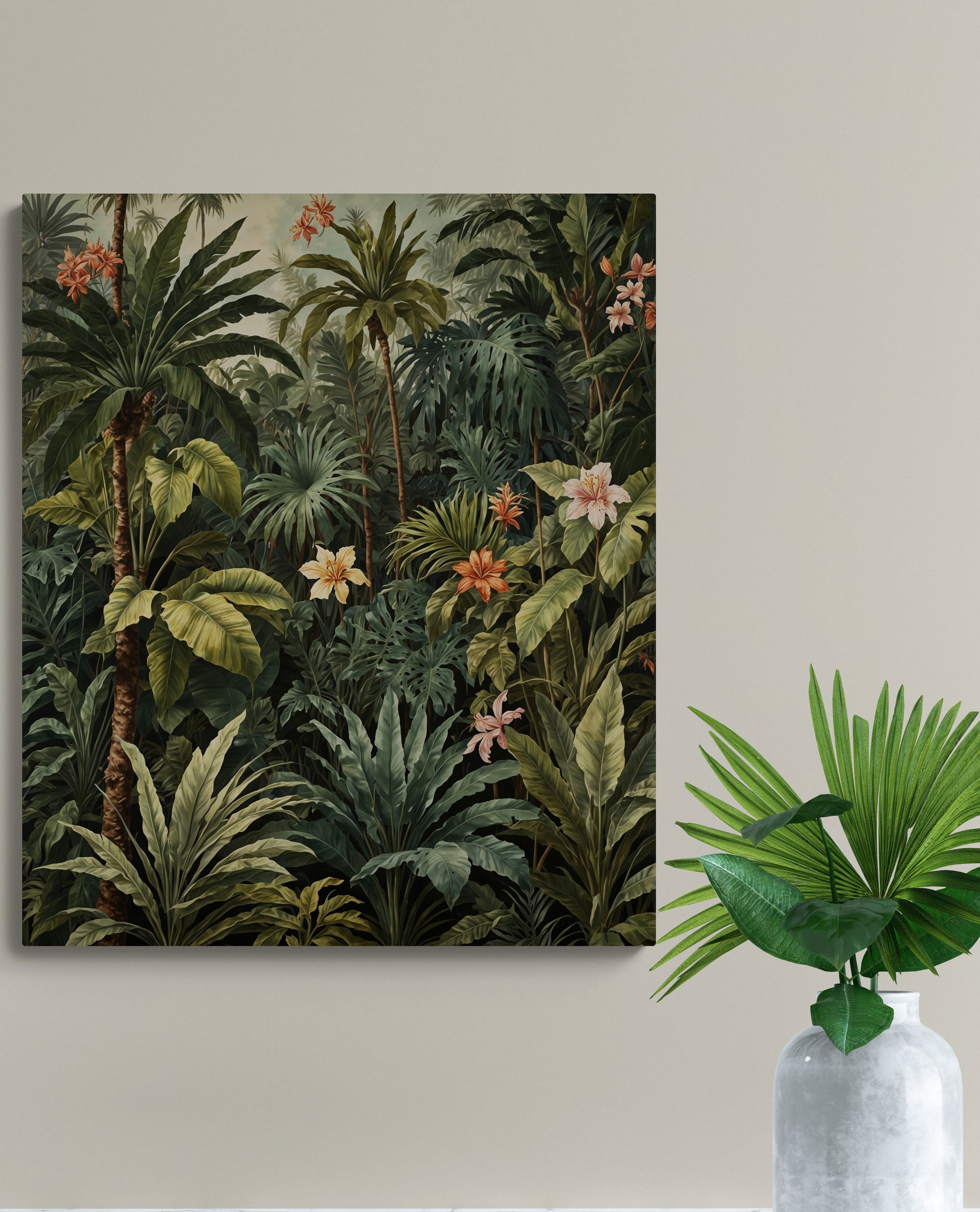 Bring the lush heights of the rainforest indoors with Jungle Canopy, a hand-painted vertical canvas art featuring overlapping banana leaves, palm fronds, and flowering vines. Its muted vintage tones add elegance to stairways, corners, or tall walls.