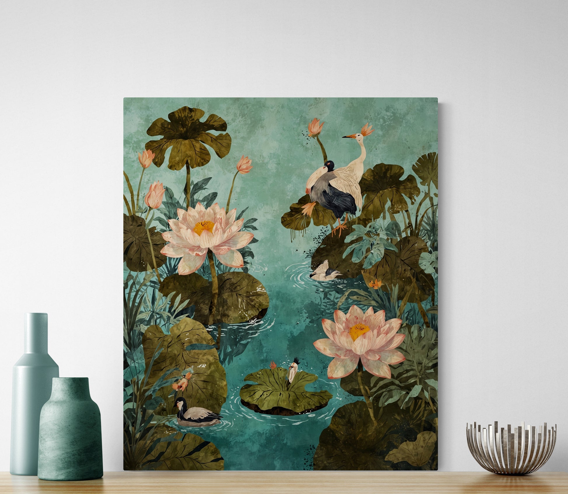 Create a serene focal point with Lotus Pond, a printed canvas capturing a still lotus pond surrounded by dense tropical greenery, elegant herons, and a delicate stone bridge. Styled in vintage botanical charm, it's perfect for calming interiors.